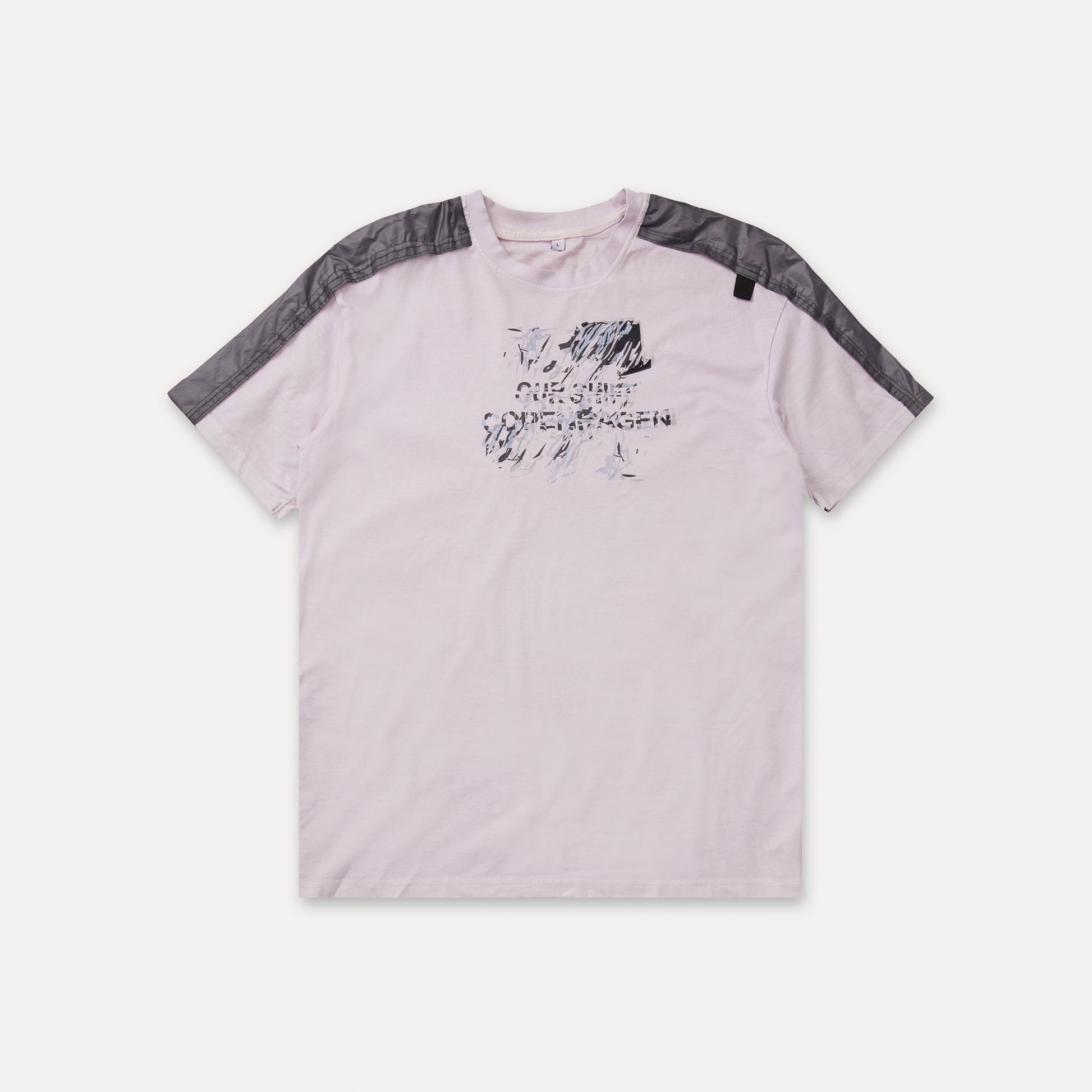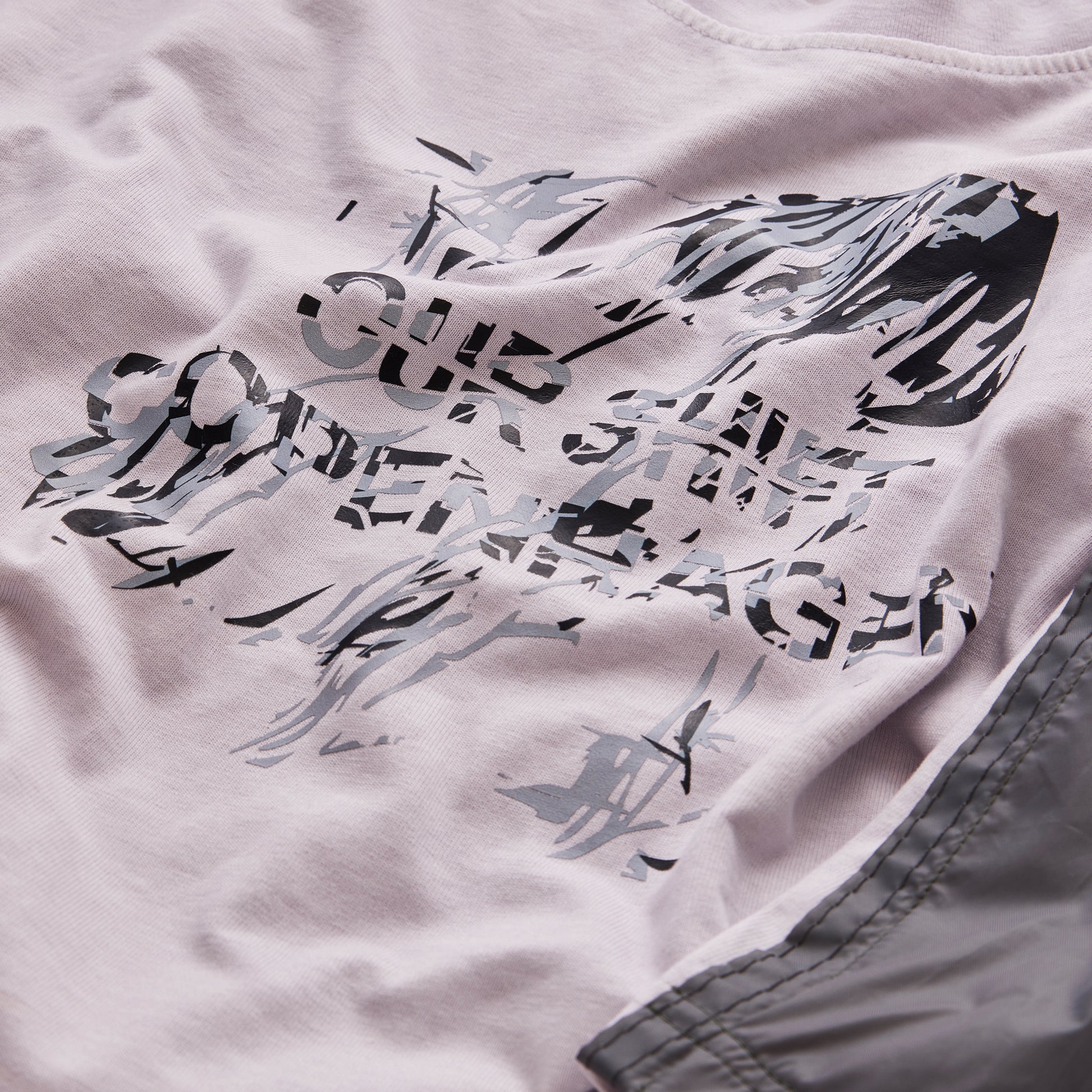 The OUR SHIFT Hybrid Tee combines soft organic cotton with upcycled tent details, creating a unique piece that blends comfort, sustainability, and urban edge. The crisp white base is contrasted by grey tent fabric panels along the shoulders, making each shirt one-of-a-kind. A deconstructed OUR SHIFT COPENHAGEN print sits at the chest, echoing the brand’s philosophy of transformation and reimagination. Designed for everyday wear yet carrying a strong statement, this tee redefines what a sustainable essential can be.
