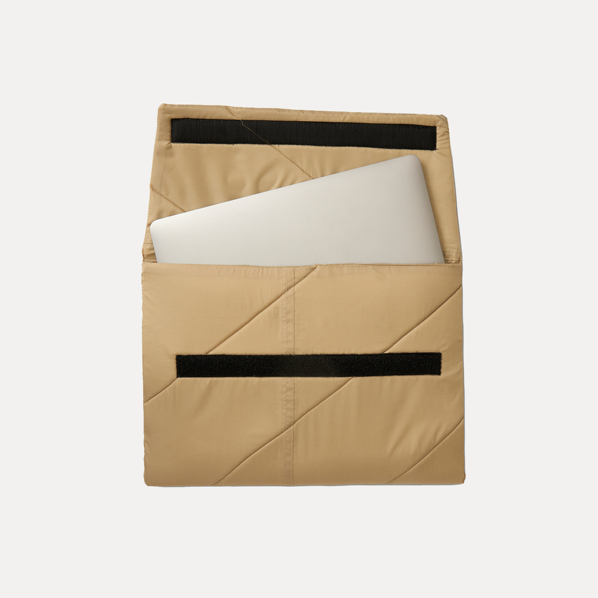 Protect your laptop with our upcycled laptop sleeve, crafted from abandoned festival tents for a unique and eco-conscious touch. Designed to fit laptops up to 13", this sleeve features bold paneling and asymmetrical seam lines for a modern, distinctive look. Combining durability, functionality, and a commitment to reducing textile waste, it's the perfect companion for your everyday needs.