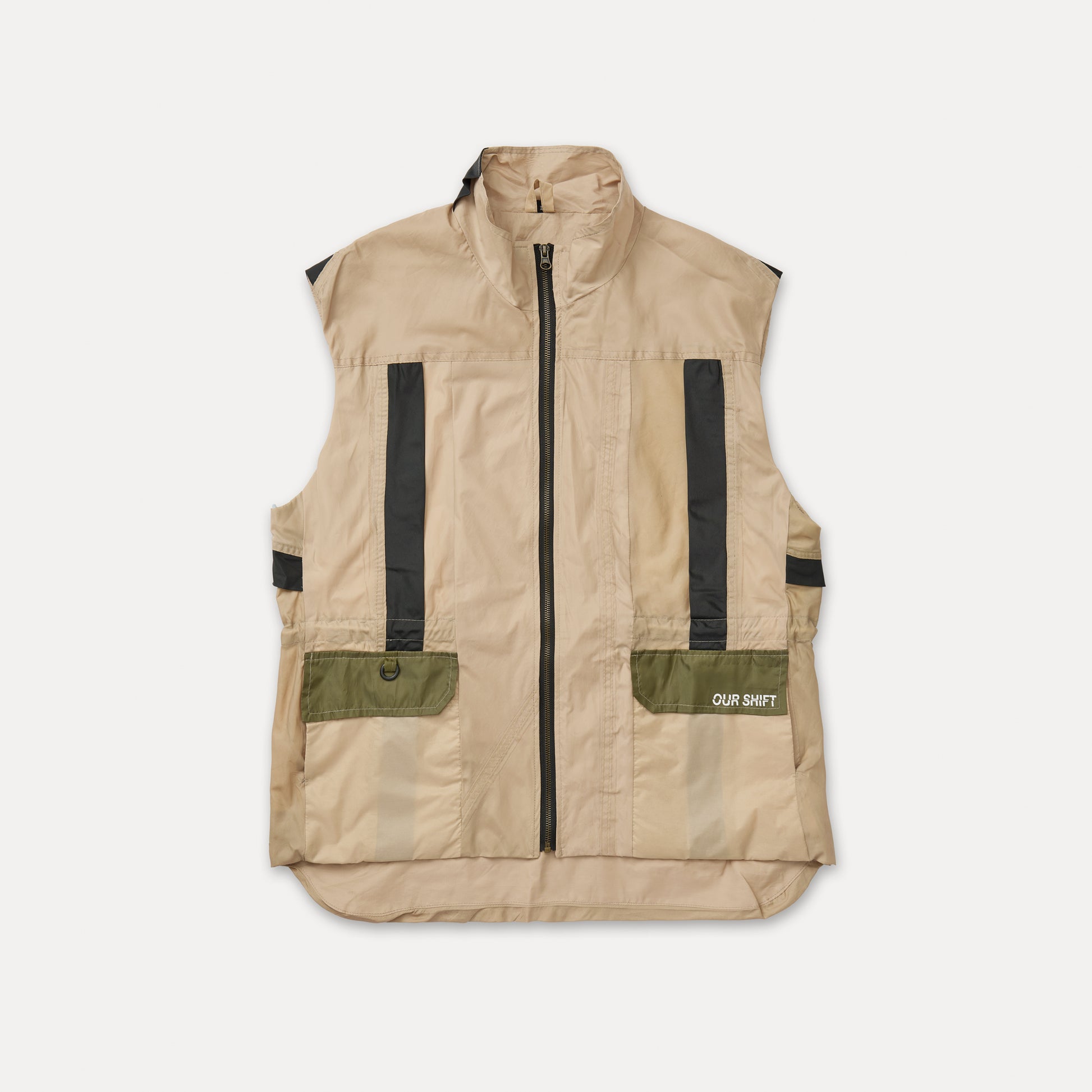 The OUR SHIFT Utility Vest is a functional piece reimagined from reclaimed tent materials, giving discarded fabrics a second life. Designed with purpose and sustainability at its core, this vest blends utilitarian details with an urban outdoor aesthetic. Featuring a high collar, full front zip, and multiple spacious pockets, it’s built for both practicality and style. Reflective details and subtle OUR SHIFT branding complete the look, making it the perfect companion for layering across seasons.