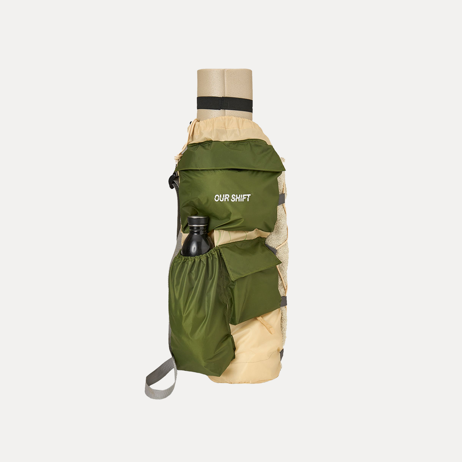 Carry your yoga essentials in style with this versatile yoga bag, designed to hold and protect a standard mat (61 cm) in its spacious main compartment. Crafted from upcycled tents, it features two convenient Velcro pockets for your smaller belongings, an elastic-top pocket for your water bottle, and a rope mesh to securely store items like a towel. Practical, durable, and sustainably made, this bag is the perfect companion for your yoga sessions.